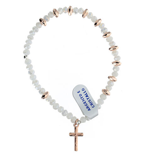 Handgefertigtes Armband, in Italien hergestellt, bestehend aus kleinen weißen Kristallen, durchsetzt mit roséfarbenen Hämatitperlen und einem kleinen Kreuzanhänger. Umfang ca. 19 cm, Perlen 3x6 mm.