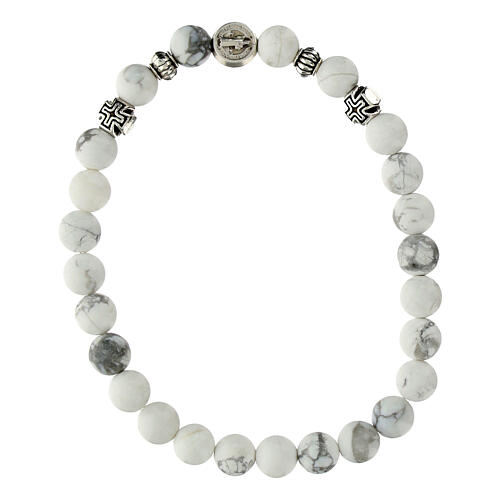 Elastisches Armband aus runden weißen Howlith-Perlen (Durchmesser ca. 5 mm), kombiniert mit glänzend versilberten Kunststoffelementen in Kreuzform (ca. 2–3 mm).