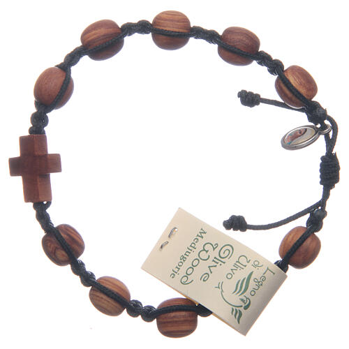 Armband aus Medjugorje, gebunden an einem schwarzen Seil mit Olivenholzperlen und -kreuzen.