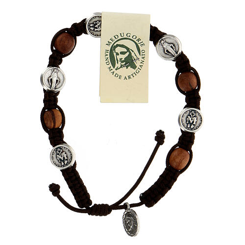 Armband aus Medjugorje mit Olivenholzperlen, die an einem Seil mit Wundertätiger Medaille befestigt sind.