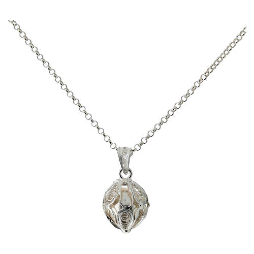 Der Anhänger ist eine vollständig von Hand gearbeitete Kugel aus 925er Silber, die ein kleines Xylophon in Kugelform im Inneren verbirgt.