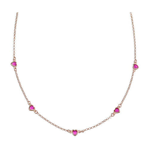 Teil der Amore Kollektion von Amen, hergestellt aus Silber mit rosé Veredelung. Sie verfügt über fünf herzförmige Charms mit 4 mm großen rosa Zirkonen. Die Kette besteht aus einem Rollo- oder Belcher-Typ mit kleinen, miteinander verbundenen gleich großen runden Gliedern. Die Kettenlänge beträgt 38 cm plus 5 cm zur individuellen Längenanpassung, das Gewicht beträgt 5 g.