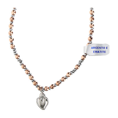 Die Halskette ist mit silbernen Hämatitperlen verziert, die die Rosenkranzkörner durchbrochen, und glänzenden rosa Hämatitperlen von 4 mm. In der Mitte der Halskette befindet sich ein Anhänger des Heiligen Herzens aus 925er Silber.
