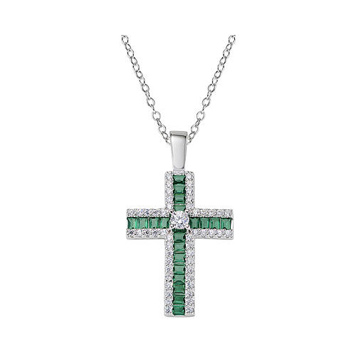 Elegante Halskette aus 925er Sterlingsilber, rhodiniert, hergestellt in Italien für die Marke Amen. Das Design umfasst eine feine Kette und einen Anhänger in Form eines quadratischen lateinischen Kreuzes. Der Kreuzanhänger ist mit rechteckigen weißen und smaragdgrünen Zirkonen verziert. In der Mitte befindet sich ein runder weißer Zirkon mit 2 mm Durchmesser.