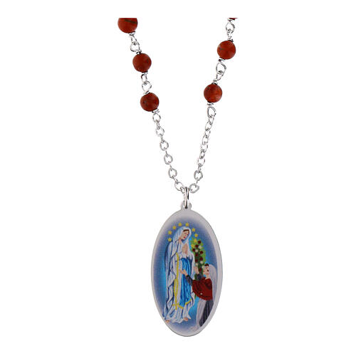 Halskette, AMEN, rhodiniertes Messing, mit roten Jaspis-Perlen und Darstellung Unserer Lieben Frau von Lourdes