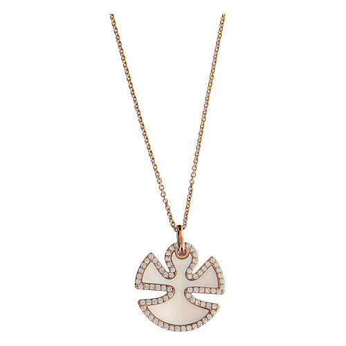 Schöne Halskette aus 925er Silber mit einem Anhänger in Form eines Engels aus Perlmutt und verziert mit weißen Steinen aus Zirkon.