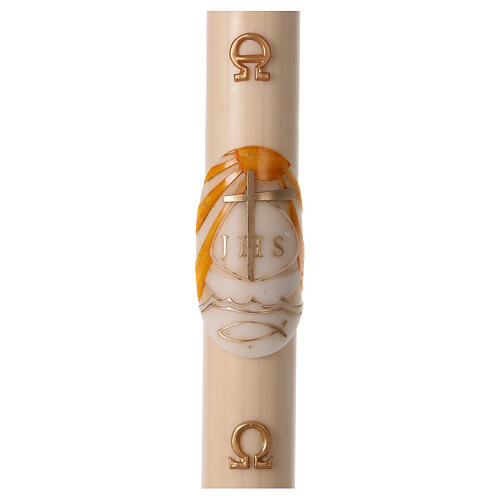 Osterkerze aus Bienenwachs, Motiv: Boot als Basrelief gestaltet plus die Symbole Alfa und Omega, MIT METALLEINLAGE.