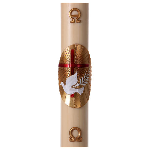Osterkerze aus Bienenwachs, Motiv: rotes Kreuz und Taube als Basrelief gestaltet plus die Symbole Alfa und Omega, MIT METALLEINLAGE.
