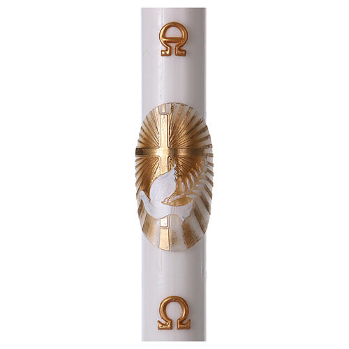 Osterkerze aus weißem Wachs, Motiv: goldenes Kreuz und Taube als Basrelief gestaltet plus die Symbole Alfa und Omega, MIT METALLEINLAGE.