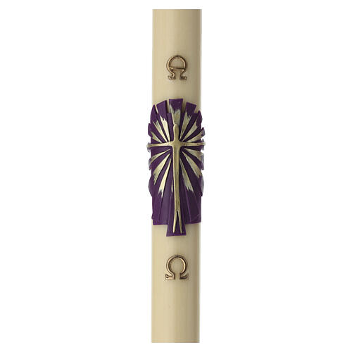 Diese Osterkerze aus natürlichem Bienenwachs hat die Gesamtmaße von Ø 8 cm × 120 cm und ist in elfenbeinfarbener Ausführung mit glatter Oberfläche gestaltet. Im zentralen Bereich befindet sich ein stilisiertes Kreuz in flachem Relief, umgeben von konzentrischen Strahlen und auf violettem Grund ausgeführt. Ergänzt wird das Dekor durch die in Relief eingearbeiteten Symbole Alpha und Omega. Die Kerze ist für eine kontinuierliche Verbrennung ausgelegt und weist eine geschätzte Brenndauer von etwa 285 Stunden auf. Die Ausführung erfolgt ohne innere Verstärkung, sodass die Kerze vollständig aus Wachs besteht.