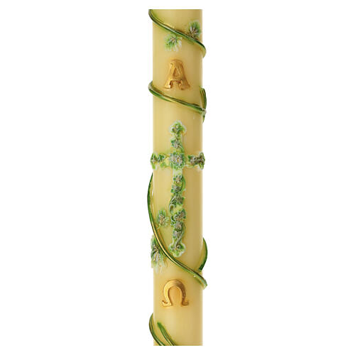 Der elfenbeinfarbene zylindrische Kerzenkörper zeigt goldene Symbole in vertikaler Anordnung sowie ein grünes Pflanzenmotiv, das entlang der glatten Oberfläche die zentrale Kreuzdarstellung begleitet.