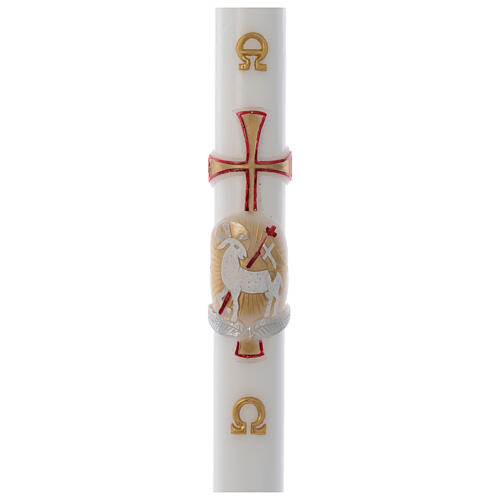 Osterkerze Wachs mit EINLAGE Agnus Dei und Kreuz 8x120cm rot und gold. Osterkerze mit Metall EINLAGE realisiert aus weissen Wachs. Die Osterkerze zeigt das Agnus Dei und ein Kreuz und die Symbole Alpha und Omega in Relief.