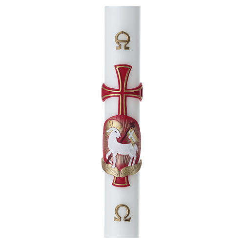 Osterkerze aus weißem Wachs mit glatter Oberfläche und zentralem Reliefdekor mit dem Lamm Gottes auf rotem Grund, mit Strahlen und eucharistischen Symbolen.