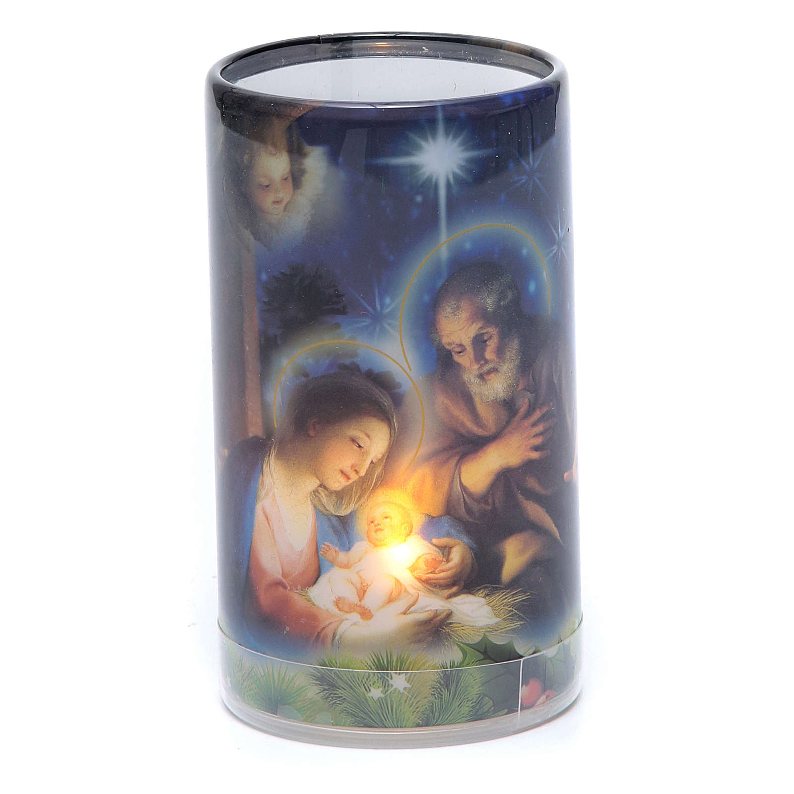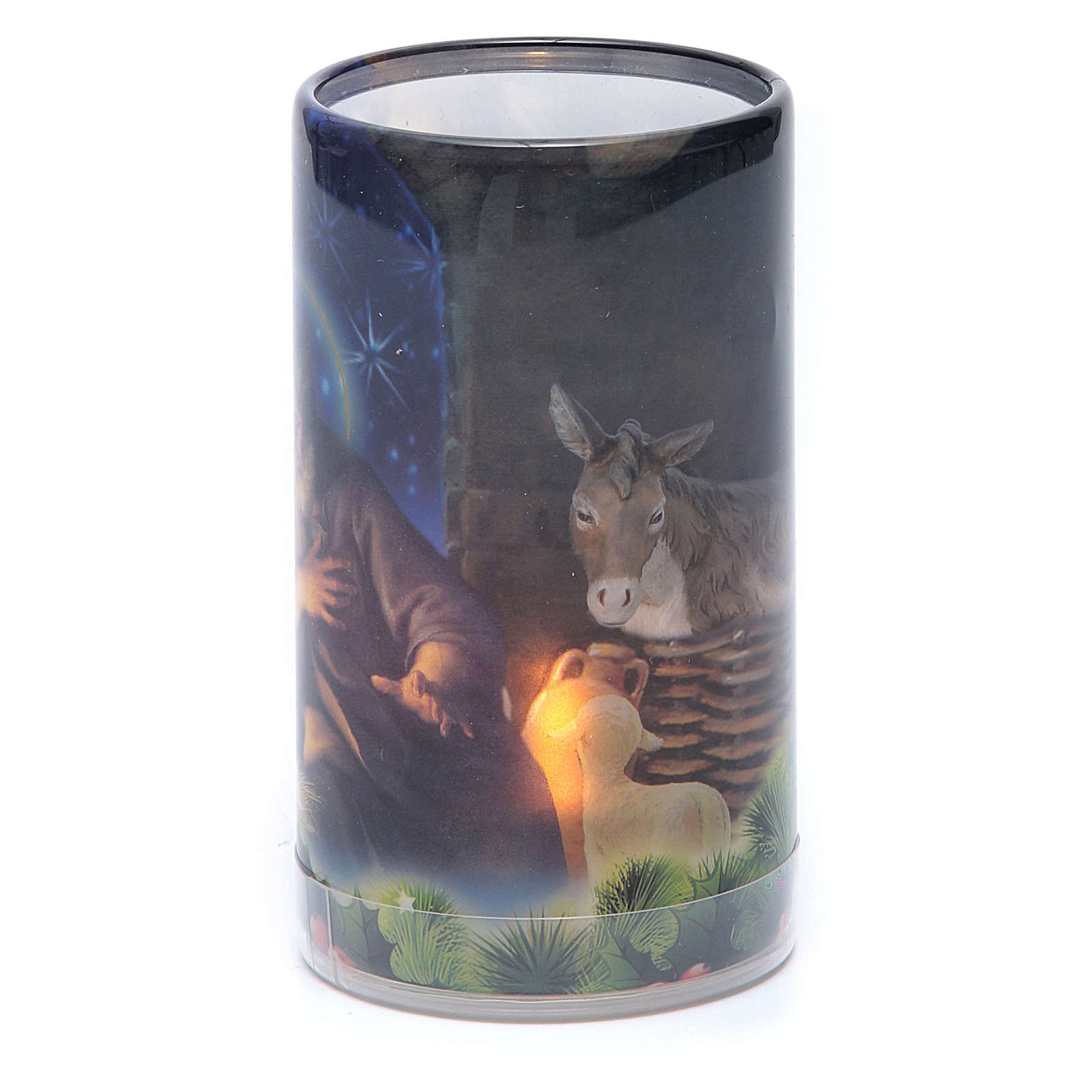 Batteriebetriebene Kerze mit weihnachtlichem Motiv und integriertem künstlichen Kerzenlicht.