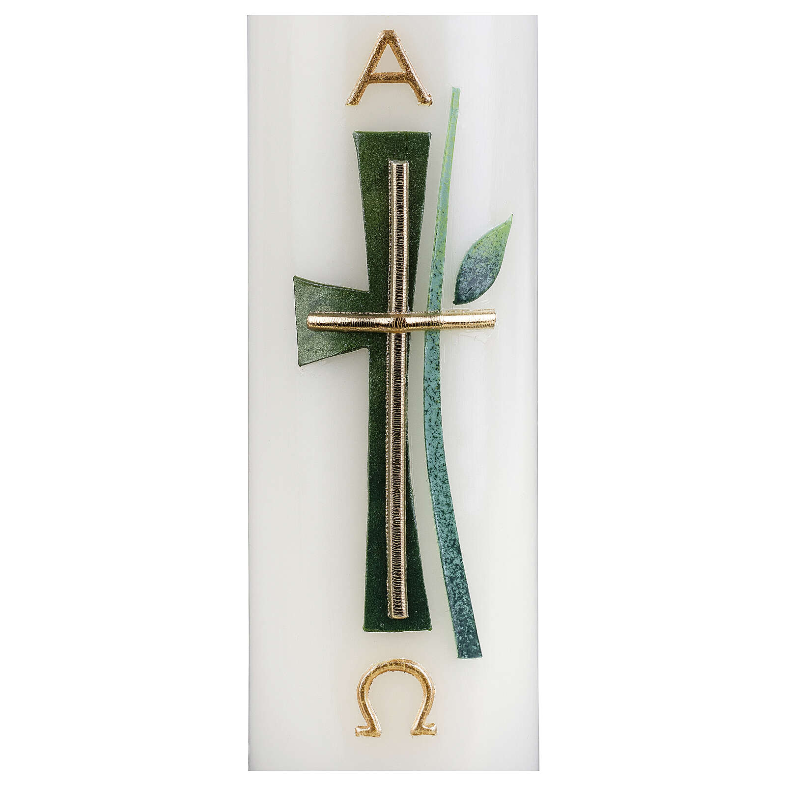 Kerze mit Kreuz und Blattdetails, 16x5 cm.