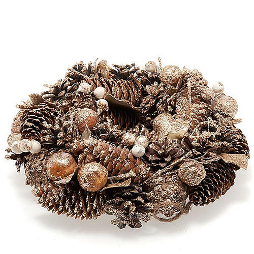 Weihnachtskrone mit Zapfen und Beeren gemacht. Sie hat vergoldeten Glitter darauf. Sie passt zu Weihnachtsdekoration, als Geschenk oder Ausstattung des Haus.