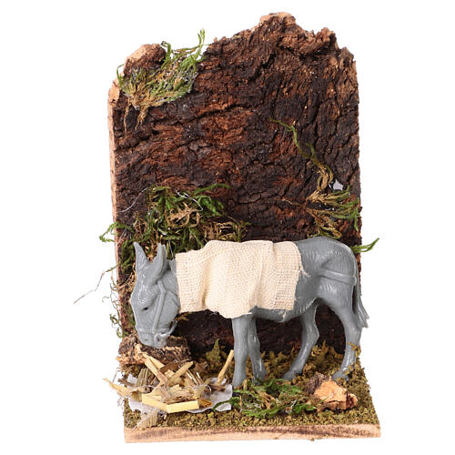 Dieser Esel in Bewegung zeigt eine Figur, bei der die Kopfbewegung das Fressen simuliert. Die Szene misst 15x8x12 cm und ist ideal für Krippen mit Figuren von 8-10 cm.