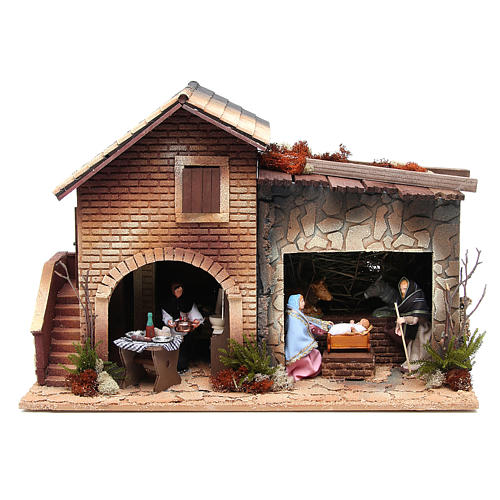 Heilige Familie mit Frau in der Kühe 12cm bewegliche Szene. Bewegliche Krippenfigur realisiert aus Terrakotta und Stoff.