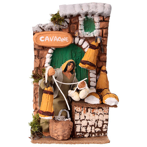 Die Szene zeigt eine Korbverkäuferin, die einen Korb mit Käse in den Händen hebt und senkt, wodurch der Darstellung Dynamik und Realismus verliehen wird. Die Szene hat die Maße 10x15x15 cm und ist ideal für Krippen mit einer 10 cm Figuren-Serie.