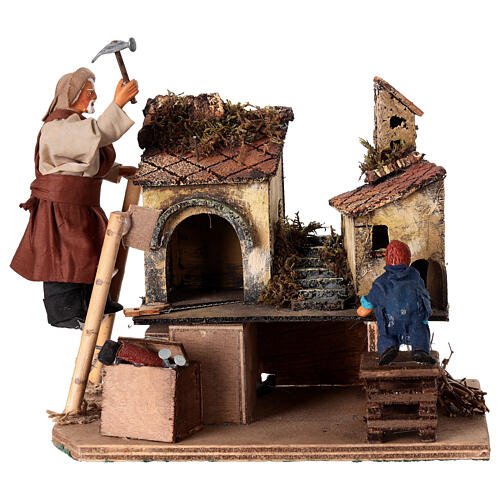 Diese animierte Szene zeigt einen Krippenbauer auf einer Leiter, der einen Nagel einschlägt, während ein Kind anwesend ist. Die Szene misst 20x14x13,5 cm und ist ideal für Krippen mit Figuren von 12 cm.