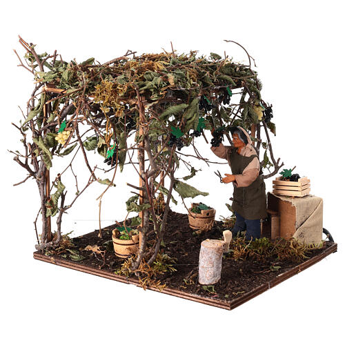Diese bewegte Szene zeigt einen Weinleser bei der Arbeit auf dem Weingut. Die Szene misst 25x23x20 cm und ist für Krippen mit einer 12 cm Figuren-Serie geeignet. Der Weinleser wird in traditioneller neapolitanischer Kleidung aus Stoff und handgefertigter Terrakotta dargestellt.
