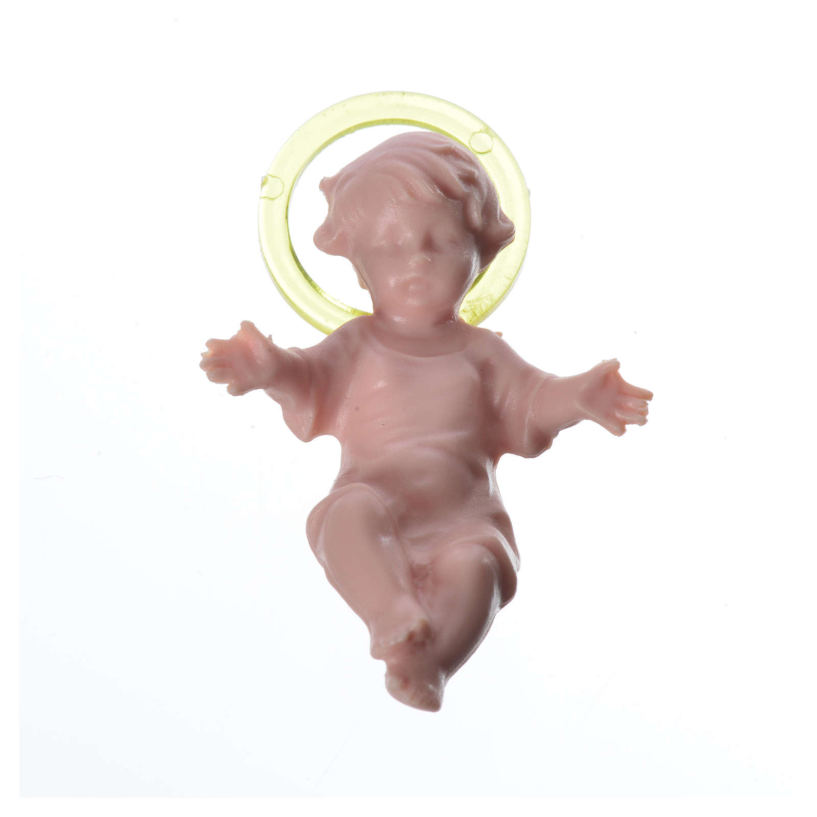 Jesuskind aus Plastik mit Aureole, 4 cm hoch.