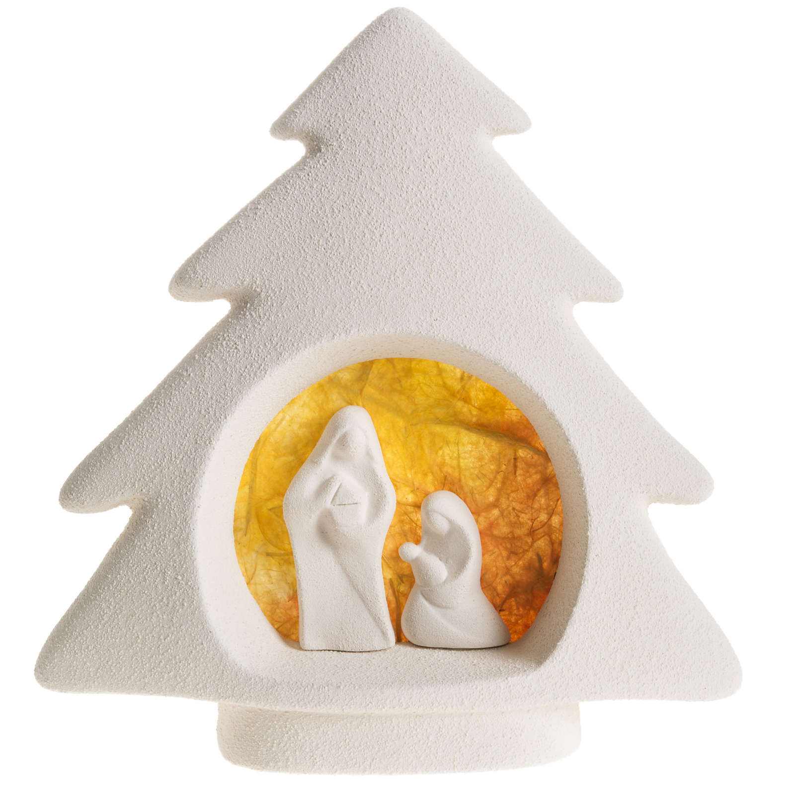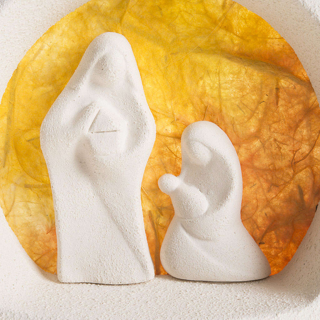 Bäumchen für Wand mit Geburt, aus orangefarbenem Ton. Es wird in Italien geschaffen, ist handgemacht und aus weissem Schamotteton. Zuerst wird der Ton durch Handpressen verarbeitet, dann wird er über 1000 Grad gebrannt. Die Verzierung und Verarbeitung sind völlig handgemacht, um der Krippe gleichzeitig Wesentlichkeit und Ausdruckskraft zu verleihen. Hohe Qualität, 100% Made in Italy, geschafft bei Centro Ceramiche Ave di Loppiano (Florenz).