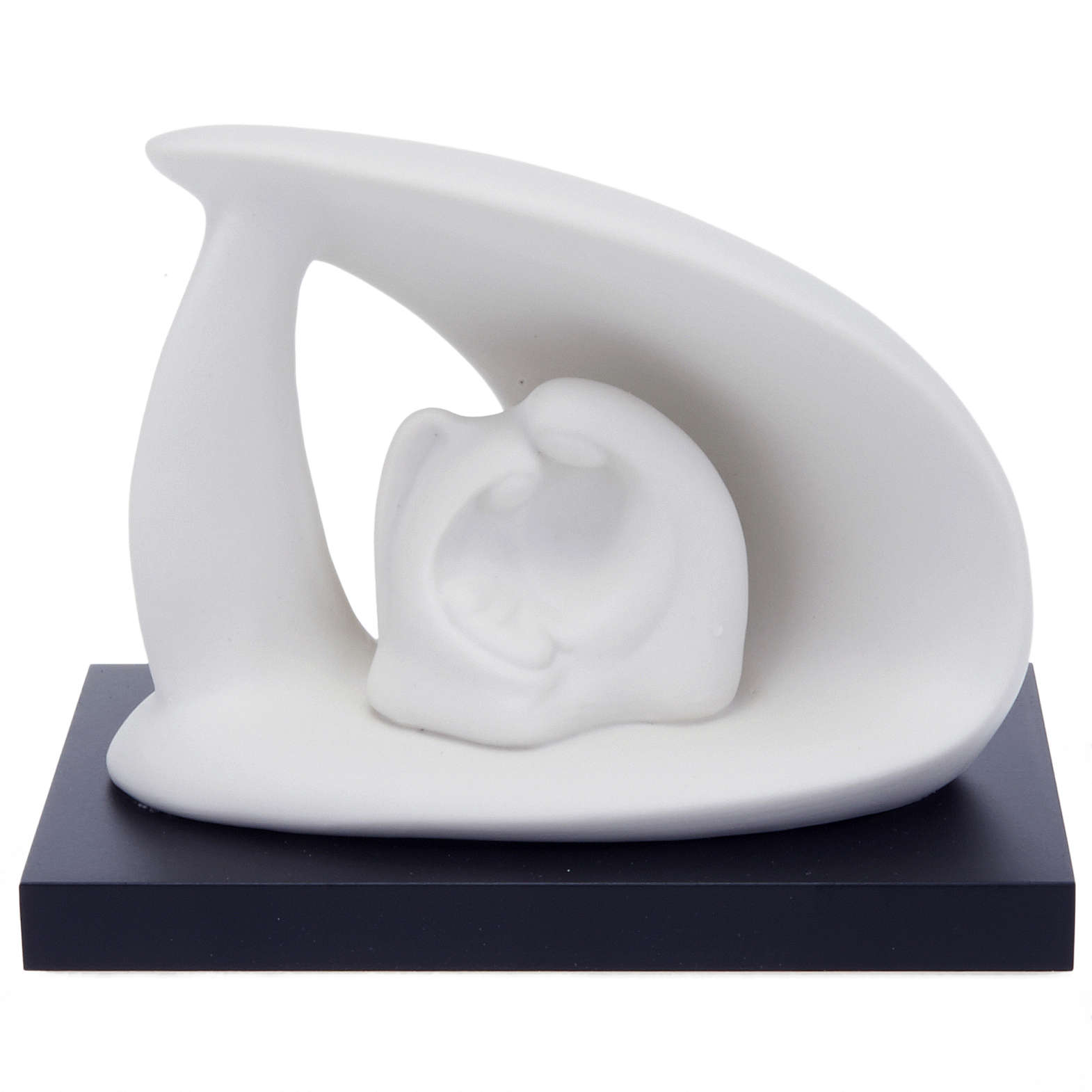 Stilisierte Krippe im Stall von Francesco Pinton aus weißem Porzellan auf dunkler Basis. Drei Personen harmonisch vereint. Geschützt durch einen stilisierten Stall.