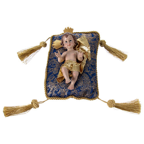 Jesuskind aus Resin mit Stoffkissen in Blau und Gold – Länge 17 cm, Kissen 20 × 13,5 cm, für 40–50 cm Krippe