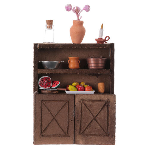 Anrichte mit Geschirr und Lebensmitteln, für Krippe mit einer 12 cm Figuren-Serie.