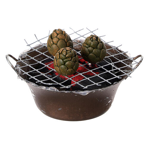Darstellung aus Metall und Ton, vollständig von Hand gefertigt. Gezeigt werden Artischocken auf dem Grill, geeignet für eine 30 cm Krippe.