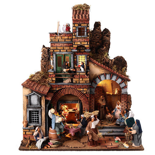 Handgefertigte Krippenszene aus Neapel mit integrierter Beleuchtung und zwölf Figuren, darunter die Heilige Familie und eine Küchenszene – passend für eine Krippe mit 13 cm Figuren-Serie.