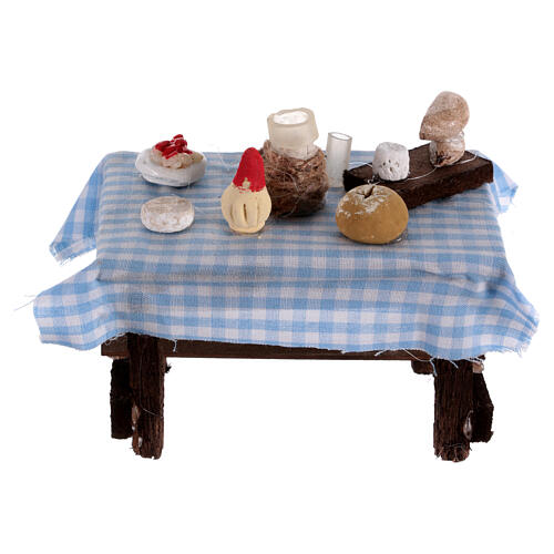 Gedeckter Tisch mit Speisen und Wein – geeignet für eine 8 cm Krippe, neapolitanischer Stil