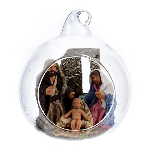 Glaskugel mit Christi Geburt im neapolitanischen Stil, Durchmesser von 7 cm.