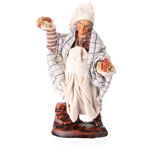 Krippenfigur für die neapolitanische Krippe, die einen Kellner darstellt, der zwei Teller Pasta mit Tomatensoße in den Händen hält. Höhe passend für eine 10 cm Krippe.
