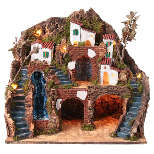 Krippenszenerie, farbenfrohes Küstendorf mit Wasserfall – neapolitanischer Stil, geeignet für eine 12 cm Figurenserie