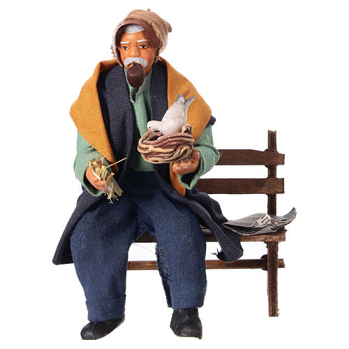 Handgefertigte Figur aus Terrakotta mit Stoffkleidung. Dargestellt ist ein Mann, der auf einer Bank sitzt, eine Pfeife raucht und ein Taubennest in den Händen hält. Geeignet für eine 10 cm Krippe.