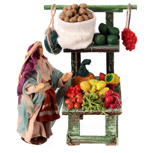 Diese handgefertigte Komposition für eine Krippe mit einer 6 cm Figuren-Serie zeigt eine stehende Figur an einem Marktstand mit Obst.