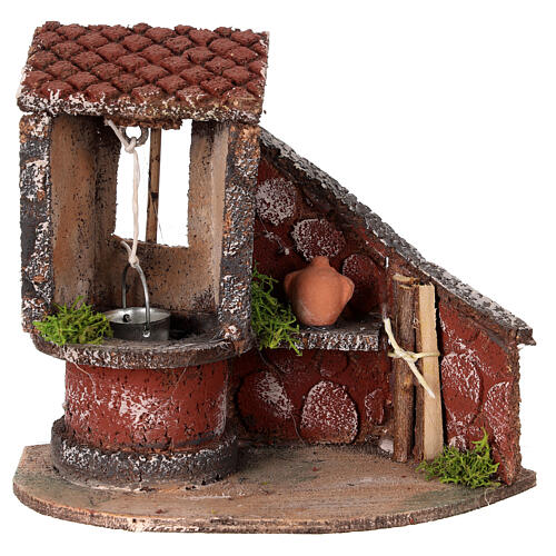 Krippenszene aus Holz und Kork mit überdachtem Brunnen und seitlicher Abstellfläche mit Zubehör. Gefertigt in Neapel von erfahrenen Handwerkern der traditionellen Krippenkunst.