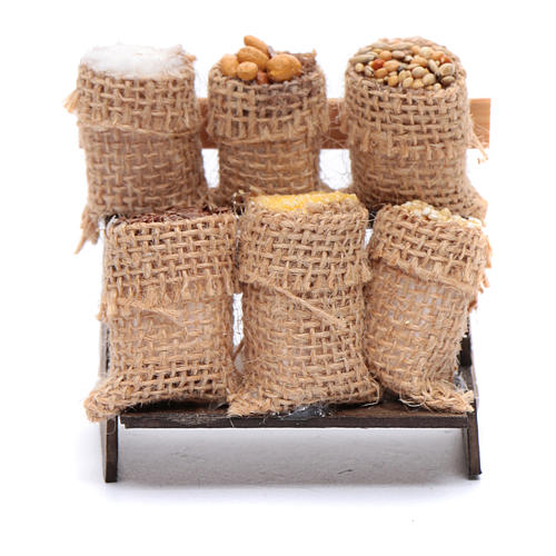 Verkaufsstand mit Jutesäcken, Miniatur für neapolitanische Krippe, max. Höhe: 7 cm.
