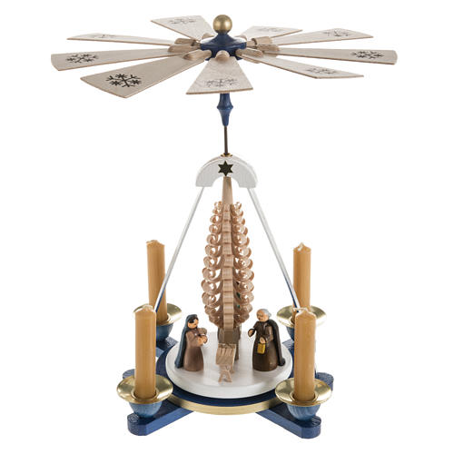 Deutsche Krippe Mod. Pyramide. Stilisierte Krippe aus Holz, die von einem deutschen Handwerker handgemacht ist. Es geht um ein hochwertiges handwerkliches Produkt. Wenn man die 4 Kerzen an den Seiten anzuendet, wird sich das Rad dank der erzeugten Hitze drehen.
