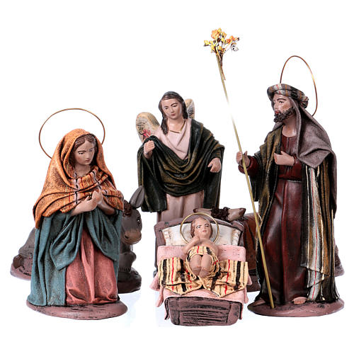 Heilige Familie 14cm spanischen Stil 6St.. Set von 6 Krippenfiguren realisiert aus Terrakotta und Stoff und handbemalt bei spanischen Handwerkern.