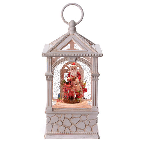 Diese Glitter-Laterne in klassischer Laternenform zeigt den Weihnachtsmann mit seinen Elfen als rotierende Figuren. Glitzerpartikel wirbeln auf und erzeugen im Zusammenspiel mit der Beleuchtung eine festliche Atmosphäre.