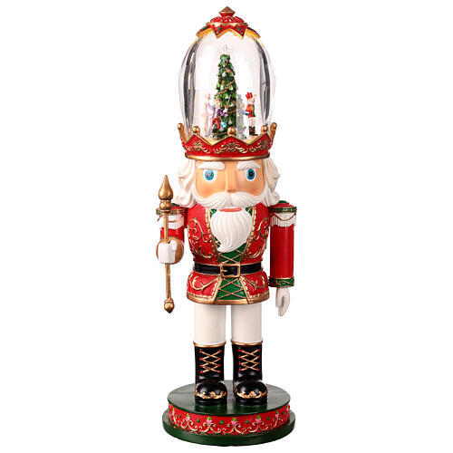 Dieser Nussknacker trägt in seiner Kopfbedeckung eine Glaskugel, die eine festliche Szene mit einem Weihnachtsbaum zeigt. Die Figuren im Inneren der beleuchteten Kugel drehen sich um den Baum und werden von einem Medley weihnachtlicher Melodien begleitet.