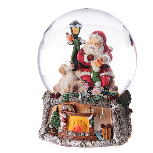 Schneekugel mit Spieluhr, Weihnachtsmann mit Tieren – H 20 cm, Ø 15,5 cm