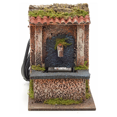 Brünnlein für Krippe mit rechteckiger Wanne, mit Strom 220V, Dimensionen 15x10x15. Dieser Brünnlein wird mit Holz, echtem Moos und Kork in Italien geschaffen. Er funktioniert, indem man ihn mit Strom 220V verbindet, nachdem man das Wännchen mit Wasser gefüllt hat.