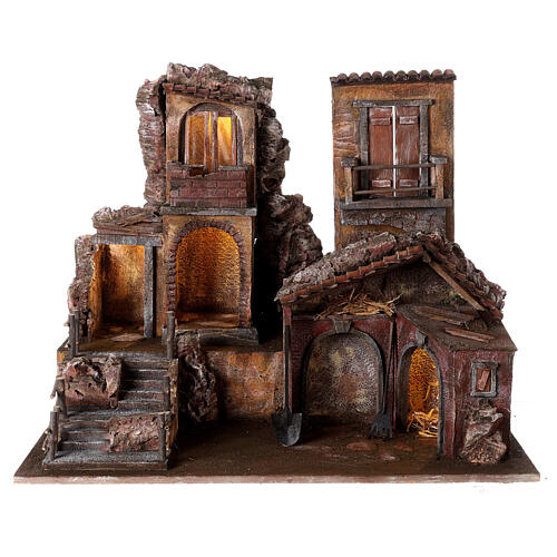 Beleuchtetes Krippendorf mit Geräteschuppen, Größe 48x58x42. Hergestellt in Italien von Handwerkern und geeignet für Krippen mit 12 cm Statuen.