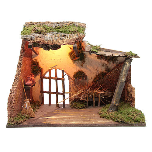 Krippenszenerie, Stall mit Beleuchtung, 35x50x25 cm
