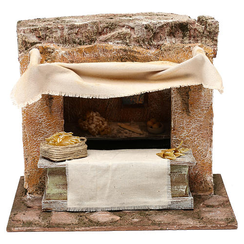 Nudelngeschäft für Krippe 20x25x15cm. Szene der Krippe realisiert aus Holz und Kork, und verfeinert mit vielen Details.