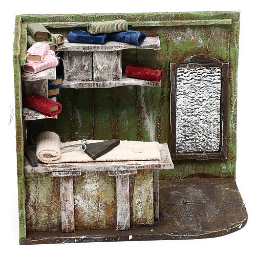Laden eines Schneiders mit Stoffen für Krippe 12 cm, 15x15x10 cm.